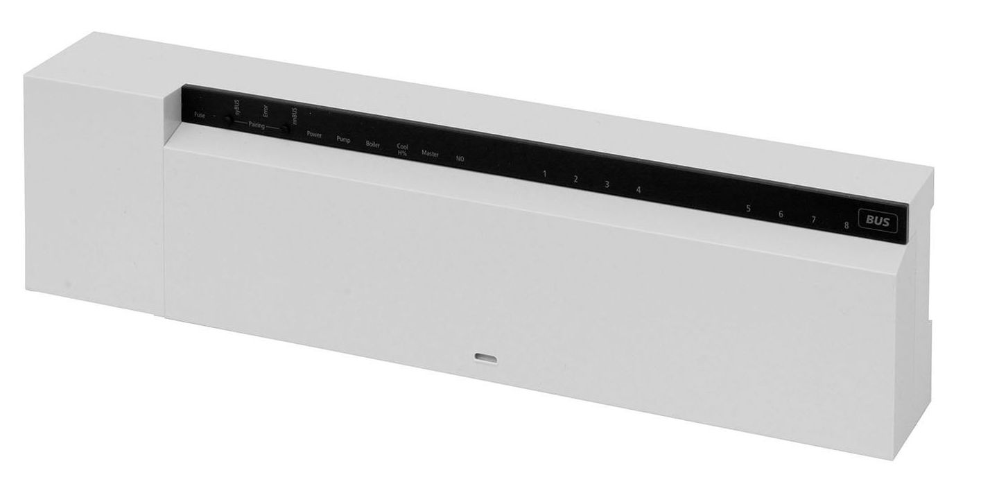 4-х канальный принимающий блок для беспроводного соединения комнатных регуляторов с сервоприводами. Беспроводной элемент управления с возможностью подключения к компьютерной сети включает встроенные модули управления насосом и котлом, ввод для внешнего коммутирующего сигнала, управляющего отоплением/охлаждением и т.д.